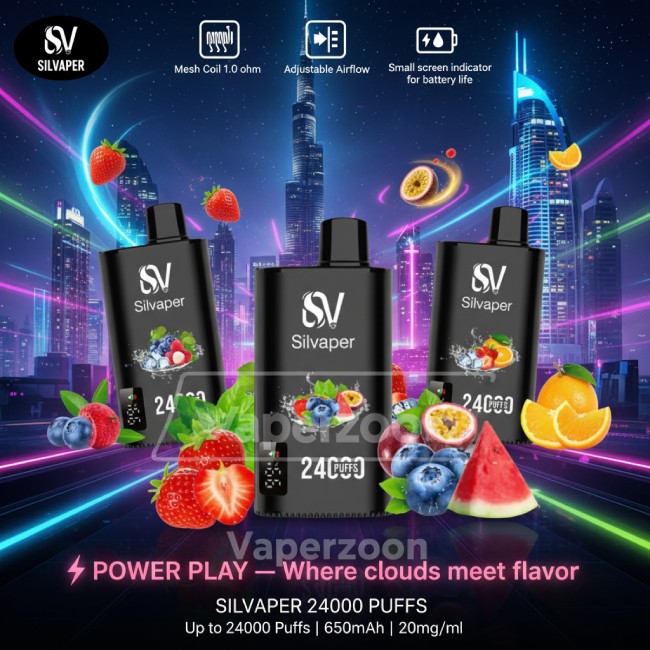 Experience endurance like never before with the SILVAPER 24000 Disposable Vape. Enjoy up to 24,000 puffs, a 650mAh rechargeable battery, 25ml pre-filled e-liquid, and rich mesh coil flavor — perfect for long, hassle-free vaping sessions.